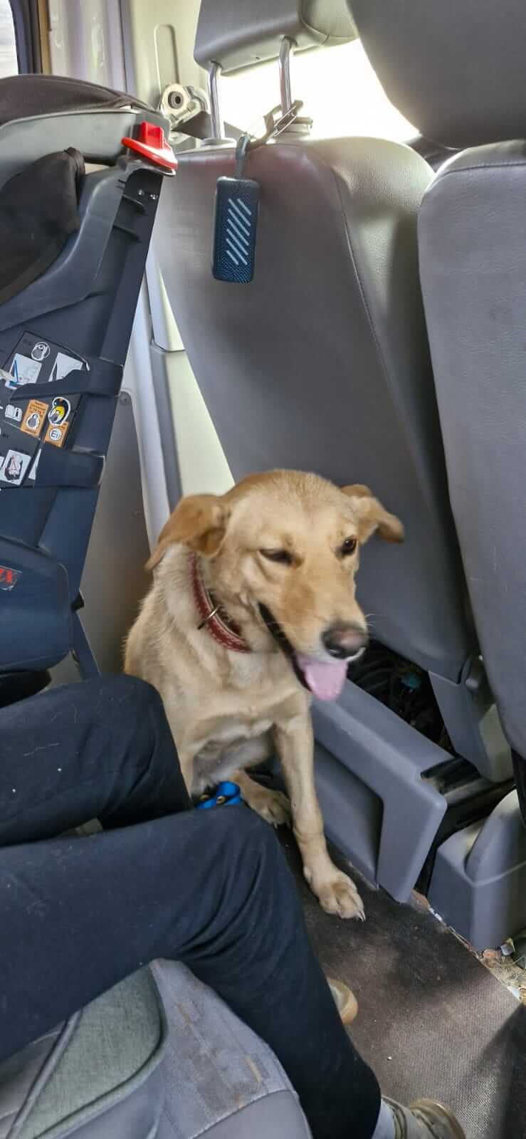 Nach zwei Tagen entschieden wir uns, eine adoption zu versuchen. Für die Einfuhr musste sie getestet, gechippt und geimpft werden. Da sie erst drei Wochen nach der Impfung über die Grenze durfte, fanden wir eine private Auffangstation. Das erste Problem: Sie wollte nicht ins Auto. Trotz Leckerlis blieb sie standhaft. Als Tim sie hineinzubringen versuchte, packte sie ihn voll Angst am Arm – biss aber nicht zu. Mit etwas Zureden und einer Dose Nassfutter stieg sie schliesslich drei-viertel ein. Ein kleiner Schubs, schnell die Schiebetüre zu, und nach etwas Streicheleinheiten von Silvia ging die Reise los.