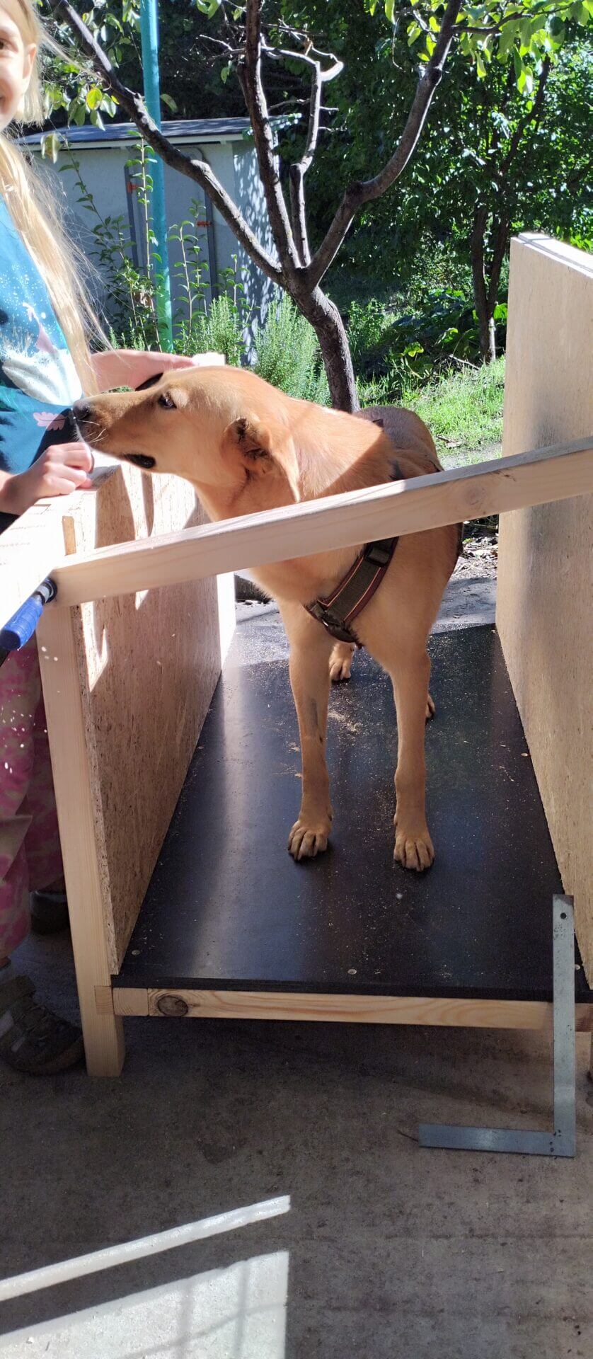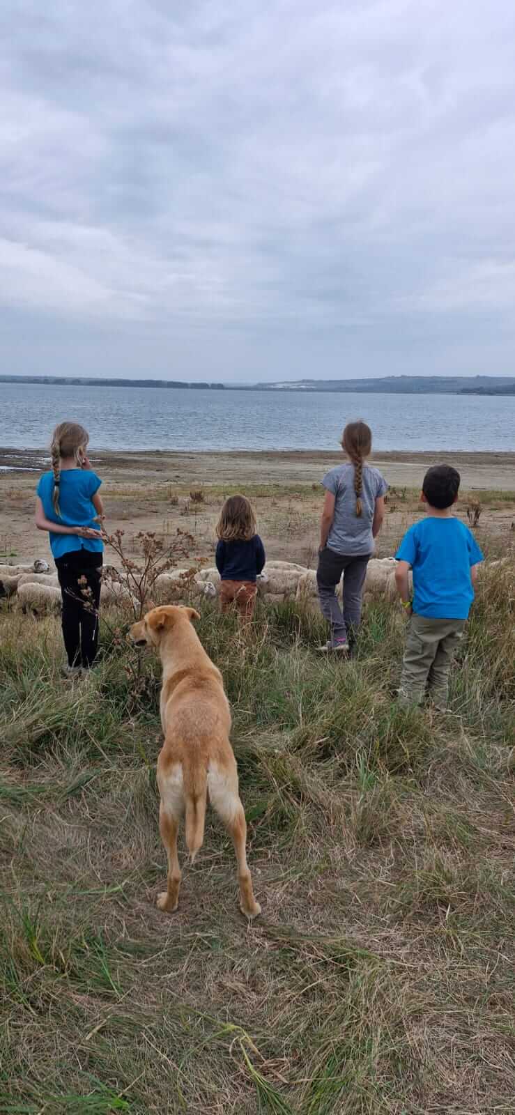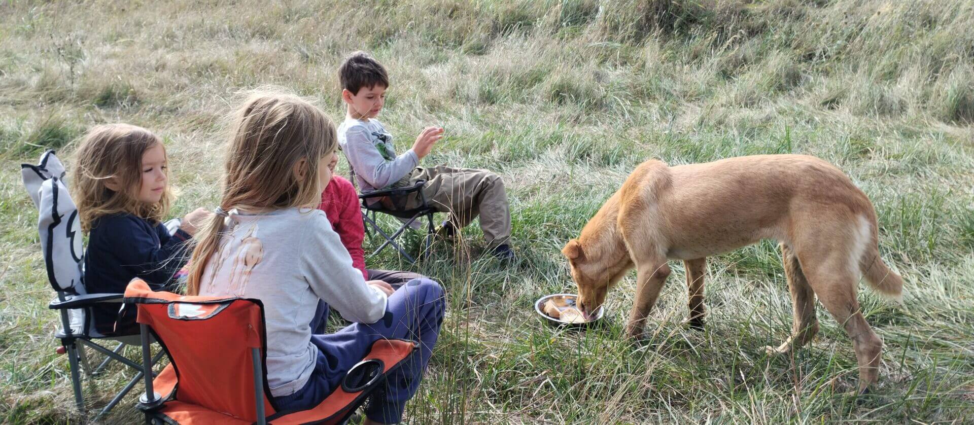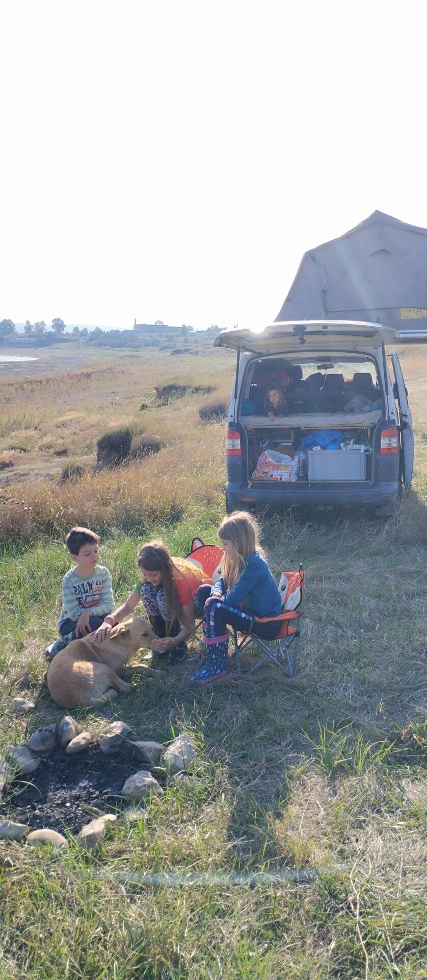 Neben der schönen Natur gab es noch einen Grund, warum wir die ganze Woche am See blieben: Am ersten Morgen tauchte eine etwa einjährige Hündin auf. Tagsüber spielte sie mit den Kindern, nachts schlief sie neben dem Auto. Kurz vor der Abreise hatte Tim noch gesagt, dass Hunde zwar toll, aber nicht mit unserem Lebensstil vereinbar sind. Und da war sie dann – Leica.